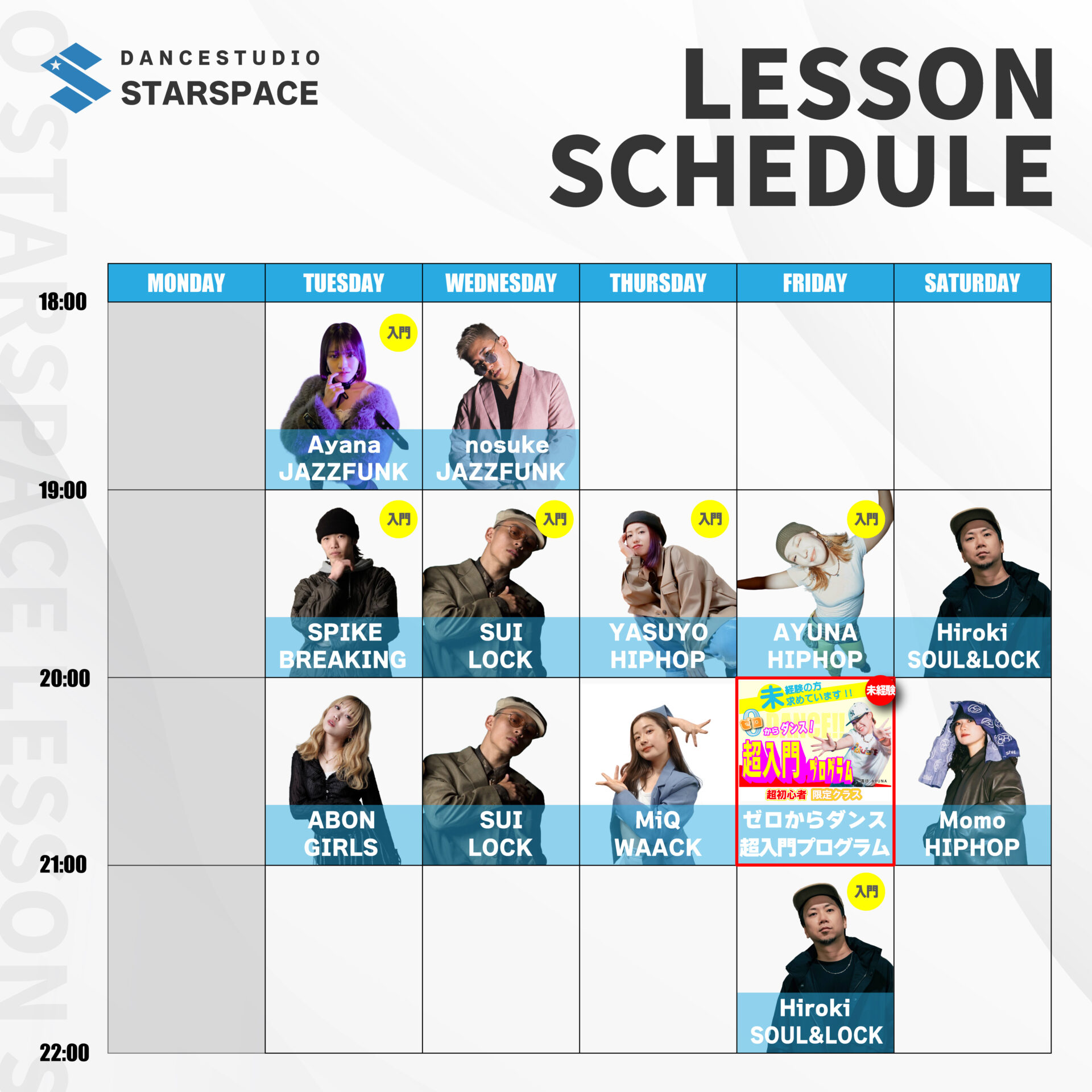 LESSON SCHEDULE レッスンスケジュール 本校(動物園前) 天下茶屋校 ※確認したい曜日を選んでください。 月 火 水 木 金 土 MONDAY / 月曜日 TUESDAY / 火曜日 Ayana🔰JAZZFUNK 入門 (キッズ向け) 18:00~19:00 体験レッスンを予約する SPIKE🔰BREAKING 入門 (全年齢向け) 19:00~20:00 体験レッスンを予約する ABONGIRLS (全年齢向け) 20:00~21:00 体験レッスンを予約する 月 火 水 木 金 土 WEDNESDAY / 水曜日 nosuke🔰JAZZFUNK入門 (全年齢向け) 18:00~19:00 体験レッスンを予約する SuI🔰LOCK 入門 (全年齢向け) 19:00~20:00 体験レッスンを予約する SuILOCK 初級 (全年齢向け) 20:00~21:00 体験レッスンを予約する 月 火 水 木 金 土 THURSDAY / 木曜日 YASUYO🔰HIPHOP 入門 19:00~20:00 体験レッスンを予約する MiQWAACK 初級 (全年齢向け) 20:00~21:00 体験レッスンを予約する 月 火 水 木 金 土 FRIDAY / 金曜日 AYUNA🔰HIPHOP 入門 (全年齢向け) 19:00~20:00 体験レッスンを予約する ゼロからダンス!超入門プログラム 3ヶ月コース制(2026年1期(1月)募集中!(全年齢向け) 20:00~21:00 詳細はこちらから▶ Hiroki🔰LOCK&SOUL 入門 (全年齢向け) 21:00~22:00 体験レッスンを予約する 月 火 水 木 金 土 SATURDAY / 土曜日 HirokiLOCK&SOUL 初級 (全年齢向け) 19:00~20:00 体験レッスンを予約する MomoHIPHOP 初級 (全年齢向け) 20:00~21:00 体験レッスンを予約する 月 火 水 木 金 土 Momo🔰HIPHOP 初級 (全年齢向け) 20:00~21:00 体験レッスンを予約する 月 火 水 木 金 土